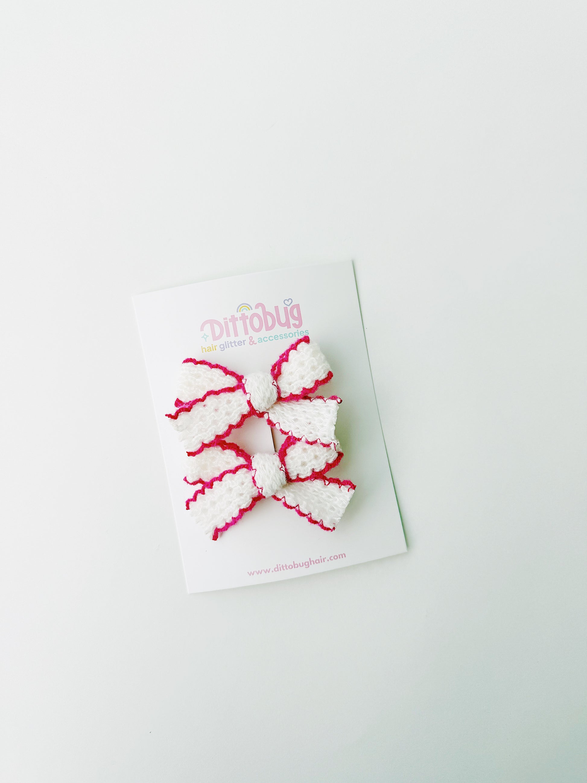 This adorable pigtail set is a white knit bow with pink edging. Perfect to complete any outfit, not matter the time of year!