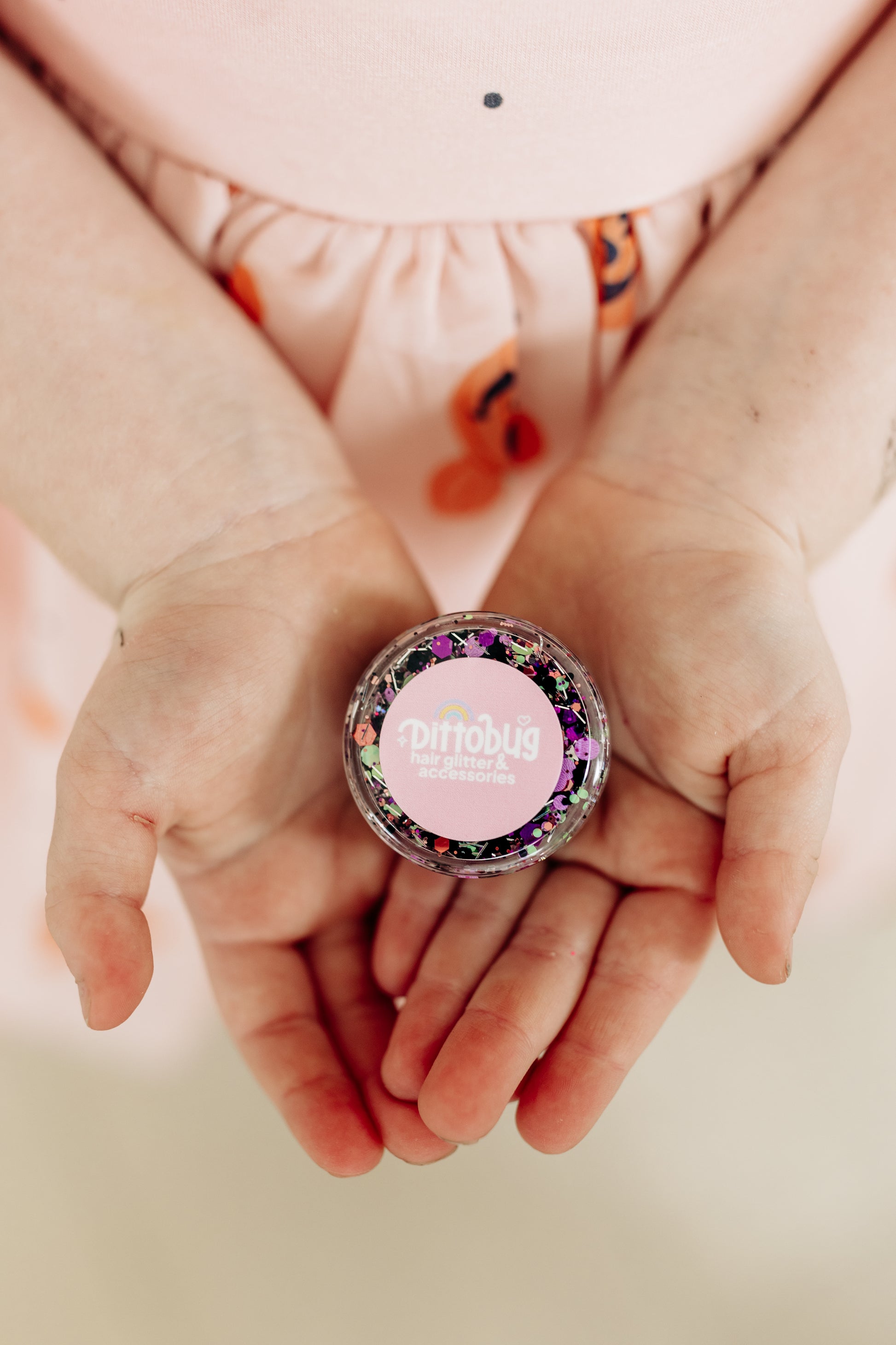 Our colorful glitters are handmade with high quality, unscented gel and bright glitter your children (and you!) will love. Look no further for a girl’s hair glitter that goes on smooth and isn’t crunchy when it dries! Safe to use on hair.