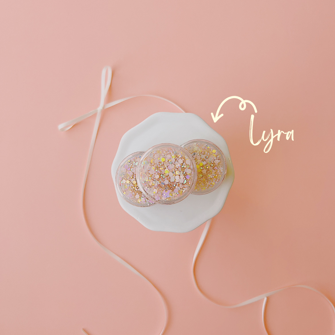 A magical mix for the unicorn-lovers! Lyra sparkles with iridescent purple, teal, light orange, and pink, and tiny unicorn heads that capture pure unicorn energy.