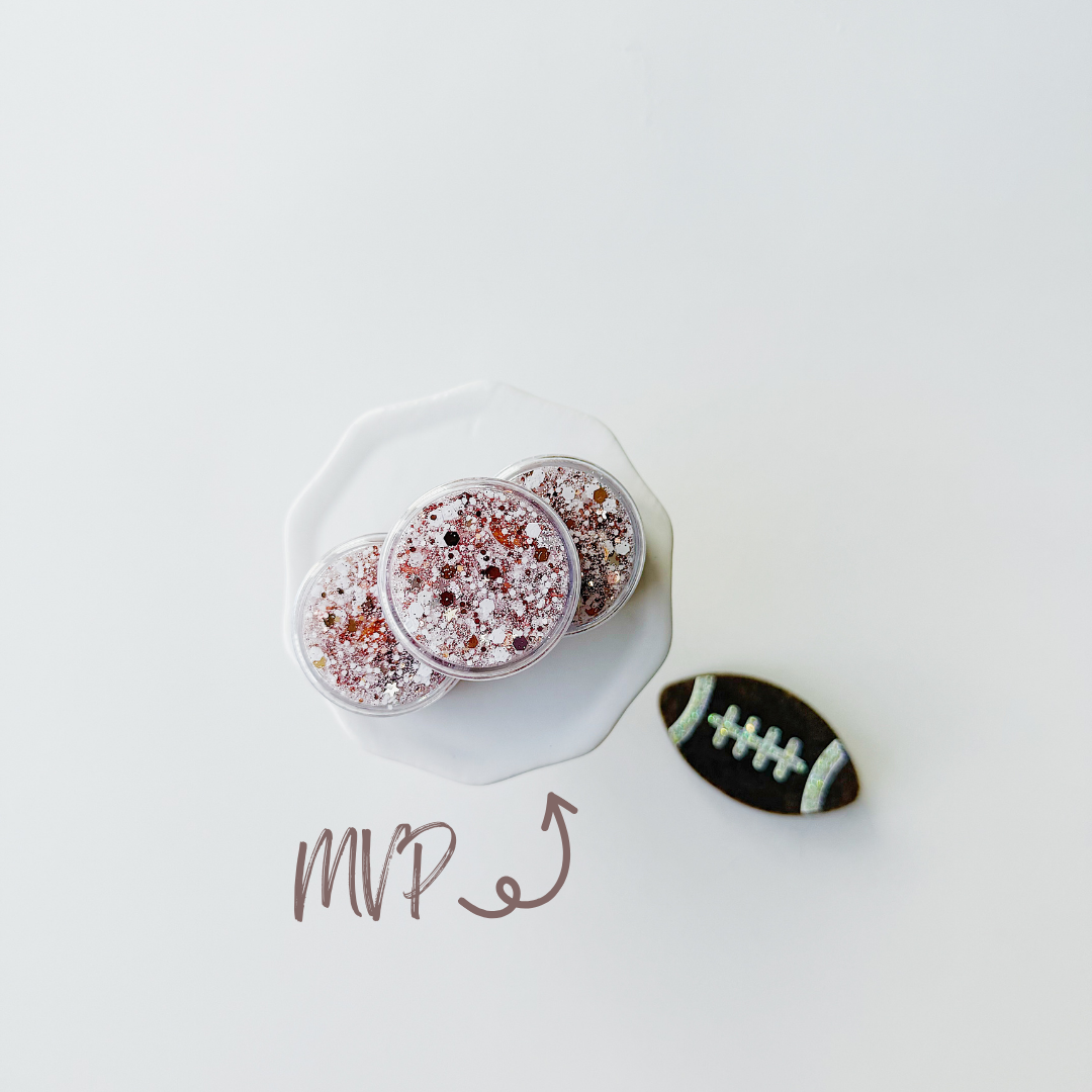 The star player of the collection! MVP features a winning combo of white glitter, bronze footballs, and silver stars. It’s bold, dazzling, and built for champions.