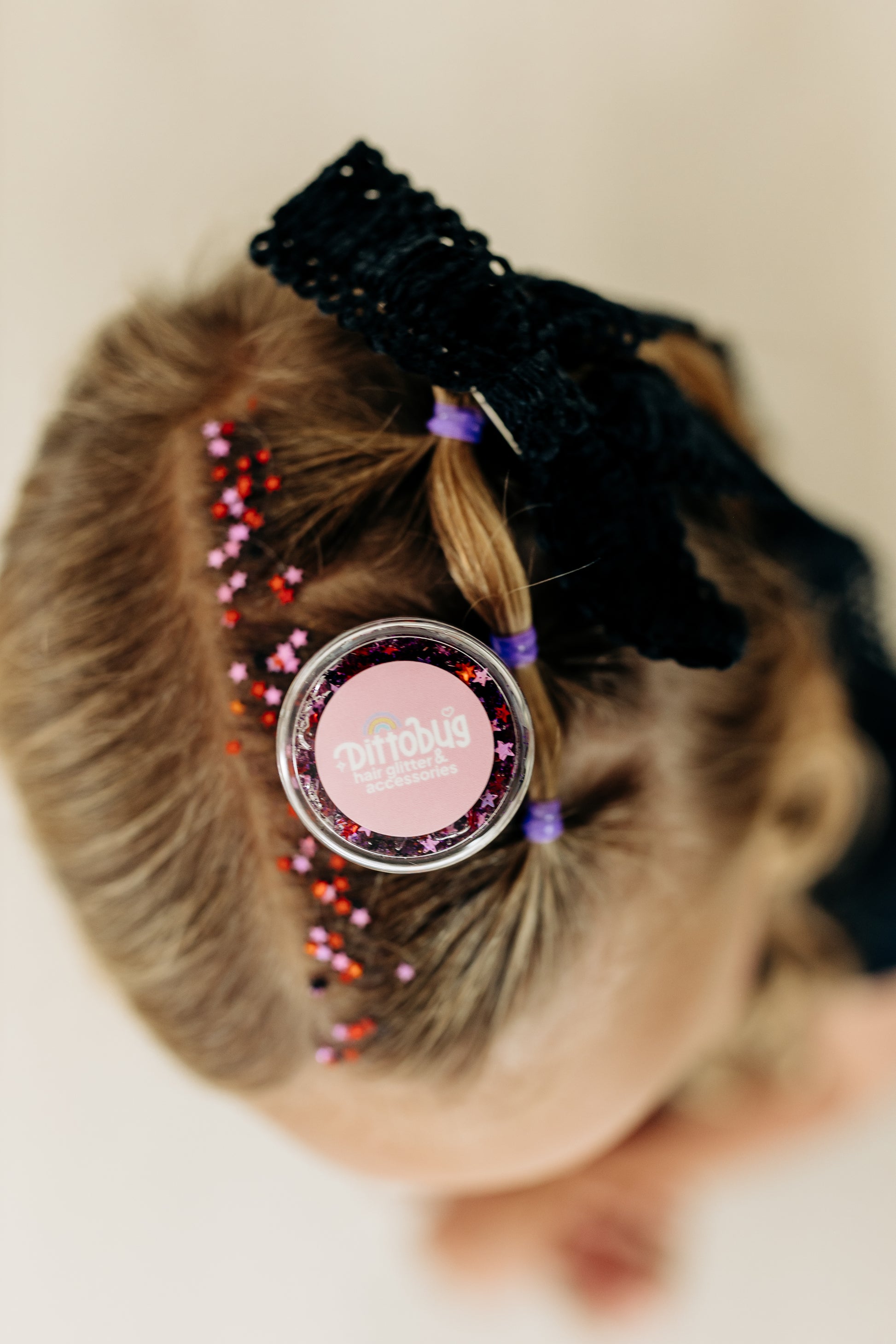 Our colorful glitters are handmade with high quality, unscented gel and bright glitter your children (and you!) will love. Look no further for a girl’s hair glitter that goes on smooth and isn’t crunchy when it dries! Safe to use on hair.